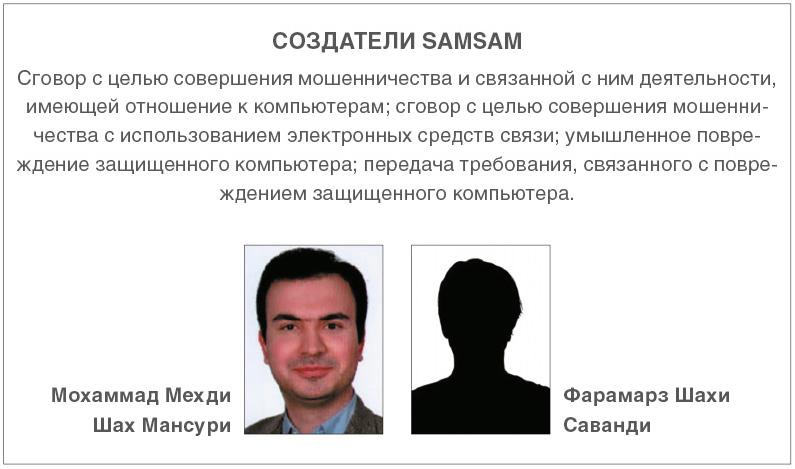 28 ноября 2018 г. ФБР обнародовало акт, обвиняющий в международном распространении программы-вымогателя SamSam Фарамарза Шахи Саванди и Мохаммада Мехди Шаха Мансури.