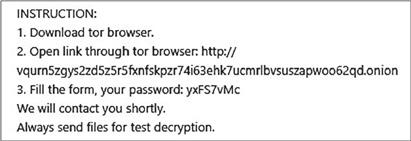 Злоумышленники пользовались платежным сайтом в даркнете. Жертва получала сообщение с требованием выкупа и информацией о расшифровке файлов, сгенерированное программой-вымогателем (рис. 1.1).
