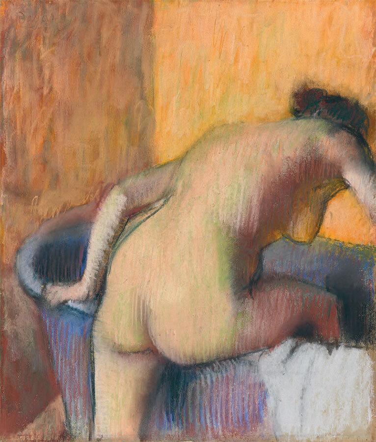 Что касается Дега, и это привлекает внимание, в его трактовке сюжетов присутствует фактор непосредственности и как бы неожиданности. Каждому приходилось сталкиваться со случайной ситуацией, когда сознание как бы выхватывает и фиксирует какую-то картинку из подсмотренных моментов, где человек, не догадываясь, что на него кто-то смотрит, ведет себя естественным образом. В такие минуты невольно у наблюдателя возникает волна эстетического отклика при виде изящества движений, чарующей пластики человеческого тела. Когда вдруг в каком-то естественном порыве человек потягивается, снимает одежду, поправляет прическу, в общем, совершает какое-то естественное движение. Подобные впечатления производит созерцание движений животных. Эффект усиливается, когда это касается обнаженных или полуобнаженных тел, которые нам доводится видеть, например, на пляже или на соревнованиях, особенно по спортивной или художественной гимнастике и фигурному катанию. В таких случаях невольно возникает впечатление, что гибкость человеческого тела не имеет пределов во множественности вариаций, которые внезапно возникают перед взором. Думается, что подобная «коллекция» впечатлений есть у многих.