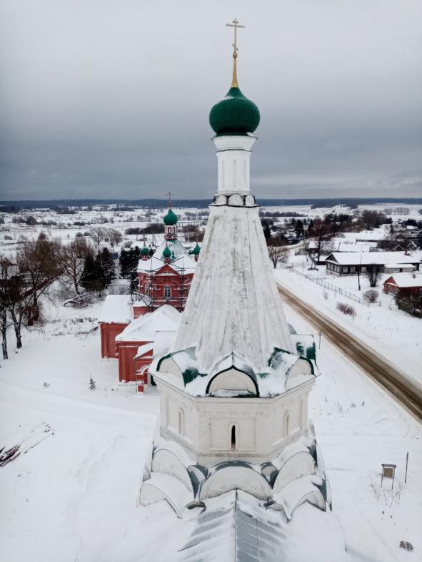 Никитский храм в с. Елизарово на территории вотчины бояр Басмановых. Вид на старый шатровый храм XVI века с колокольни (звонницы), 1.01.2022 г. Все фото, использованные в книге, принадлежат автору.