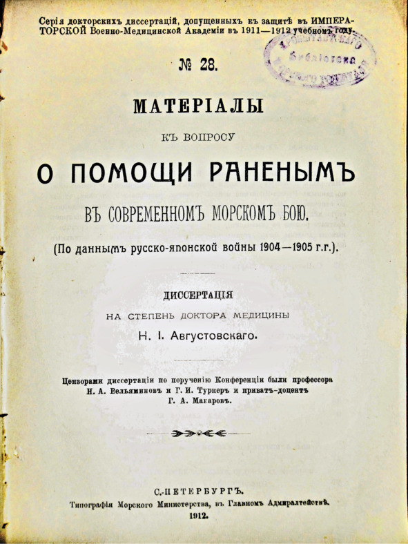 Большая удача нашего альманаха в том, что организационном центре книги среди ряда исторических документов стоит диссертация порт-артурца, участника русско-японской войны, врача эскадренного броненосца «Пересвет» Н.И.Августовского. Один из оттисков диссертации Августовского (капитальный труд, 200 страниц, 5 авторских листов) «О помощи раненым в современном морском бою (по данным русско-японской войны 1904–1905 гг.» хранится в Кронштадтском военно-морском госпитале (35-м ВМГ) и приводится в альманахе с разрешения командования (возможно, впервые с 1912 г.).