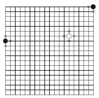 На рисунке 3 у белого камня отмечены четыре дыхания. Это четыре направления развития и четыре возможные связи со своими или чужими камнями. Степени свободы отмеряют время жизни камня. Белый камень может быть окружен и захвачен четырьмя черными. Для этого черным нужно занять все дыхания белого.