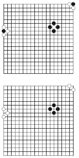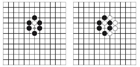 Слева на рисунке 5 белый камень окружен черными. У белого есть одно дыхание, поэтому он еще в игре. Представим, что внешняя ситуация изменится в пользу белых, например, как справа на рисунке. Теперь у белого появился шанс на спасение. Обратите внимание на два черных камня, у которых есть только одно дыхание. Конечно, игр