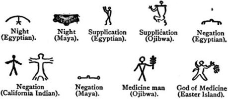 More important in its development, however, was the picture. Primitive men all over the world very soon learned to make pictures, very crude and simple to be sure, but indicating fairly well what they stand for. These pictures may be so arranged and conventionalized as to convey a good deal of information. The position of a human figure may indicate hunger, sleep, hostility, friendship, or a considerable number of other things. A representation of a boat with a number of circles representing the sun or moon above it may indicate a certain number of days’ travel in a certain direction, and so on indefinitely. This method of writing was highly developed among the North American Indians, who did not, however, get beyond it.