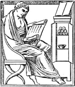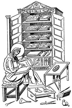 The mediæval scribe, or copyist, had in addition to his quill, ink, and vellum, a pair of compasses to prick off the spacing of his lines, a ruler and a sharpened instrument or pencil with which to draw the lines upon which he was to write, a penknife for mending his pens, an erasing knife for corrections, and pumice and agate, or other smooth substance, for smoothing the scratched surface. The accompanying illustration shows the mediæval scribe and his outfit in an extremely interesting manner. In the background appears the bookcase with its doors open showing the manner in which books were then kept, laid on their sides and not standing on their ends. The writer is busily at work upon his manuscript and scattered around him are the tools of his trade. The inkstand is on the table before him, the knife on one of the library shelves, the compasses, a ruler, a ruling pencil, a rubber for smoothing down the vellum, an open pen case, and other implements are all clearly shown.