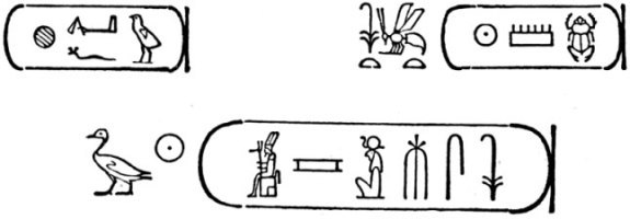 Names in hieroglyphic text of three of the most famous Pharaohs, Cheops, Thothmes III and Rameses II.