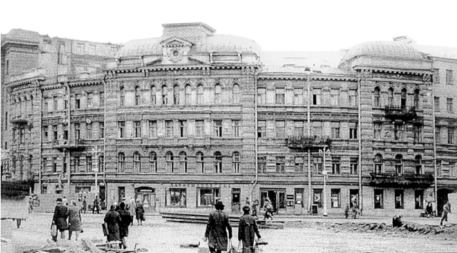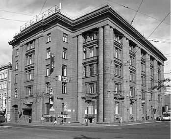 Следующее на нашем пути облицованное серым гранитом с мощной колоннадой монументальное здание на углу площади Ленина и улицы Комсомола № 4/41. Это здание, первоначально предназначавшееся для универмага, своей массивностью «сталинского ампира» больше напоминает архитектуру времен германского Третьего рейха. Его возвели в 1935–1940 гг. (арх. Я. О. Рубанчик, А. Д. Балков и Н. И. Иоффе), а в конце 1940-х гг. перестроено по проекту архитектора Б. С. Збаржа[120].