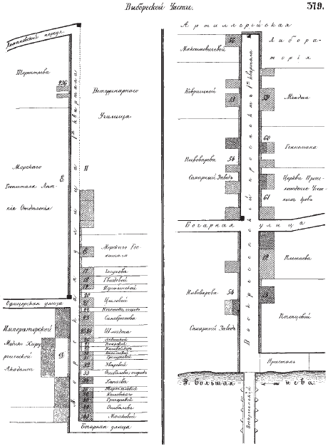С 1870 по 1917 г. в недошедшем до нашего времени доме № 37 находилось отделение Санкт-Петербургской таможни. Учреждение этого отделения стало одной из мер по устройству «пограничного движения по железной дороге», согласно высочайше утвержденному мнению Государственного совета от 9 мая1870 г. Новое таможенное учреждение располагалось по следующему адресу: «Выборгская часть, 1 участок по Симбирской ул. при станции „Петербург“ Финляндской железной дороги, д. 37». Об этом исчезнувшем здании известно следующее: рядом со станцией располагался окруженный стеной «…просторный двор для телег или саней, привозящих или увозящих товары… в западной части этого двора находился трехэтажной дом, купленный вместе с двором; тут же в нижнем этаже – коридор и четырнадцать комнат, в которых помещались финляндские таможенники. Этаж второй и третий – средний и верхний – были заняты квартирами служащих при железной дороге…». И только в 1928 г. Таможня при Финляндской железной дороге прекратила существование, передав свои функции единой Ленинградской таможне[131]. В отличие от бывшего дома Таможни другой «Дом железнодорожников» под № 35 дошел до нашего времени.
