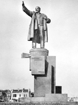 В августе 1924 г. в Академии художеств открылась выставка конкурсных проектов. Еще до ее открытия в печати и устных выступлениях деятели искусства и общественность начали дискуссию о характере будущего памятника. Архитектор A.C. Никольский был убежден, что это должен быть строгий и лаконичный архитектурный монумент символического характера. Его поддержали многие, но были и сторонники более традиционных решений. Прикованный к инвалидному креслу Б. М. Кустодиев очень живо реагировал на дискуссию и утверждал свое понимание памятника: «Попытки изобразить Ленина в моменты ораторского подъема, в движении, кажутся мне неудачными. В искусстве гораздо больше говорит намек на движение, начало движения, чем передача самого процесса… Я на стороне тех, кто отстаивает архитектурный памятник. Гигантская фигура человека в пиджаке, да еще жестикулирующего, выглядела бы несуразно. Другое дело – бюст или барельеф как часть памятника (например, на фасаде здания); это было бы уместно. Словом, памятник Ленину представляется мне не в форме статуи, а в плане монументального архитектурного сооружения». Именно таким и был проект выдающегося зодчего и художника A.C. Никольского, так нигде и не реализованный.