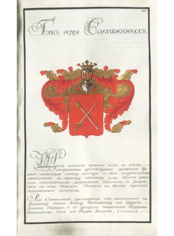 Соковнины, «лихвинские и карачевские дети боярские», попали в среду московской знати по близкому родству с Милославскими. Впоследствии род Соковниных был внесен в VI часть родословной книги Московской, Ярославской, Симбирской, Тульской, Орловской губерний. Герб рода Соковниных внесен в Часть 2-ю «Общего гербовника дворянских родов Всероссийской империи»: «Щит имеет красное поле, в коем изображаемы крестообразно серебреная Булава, имеющая головку золотую и Меч, остроконечием обращенный к левому верхнему углу. Щит увенчан обыкновенным дворянским шлемом с дворянской на нем Короною. Намет на щите красной подложенный золотом» (л. 62).