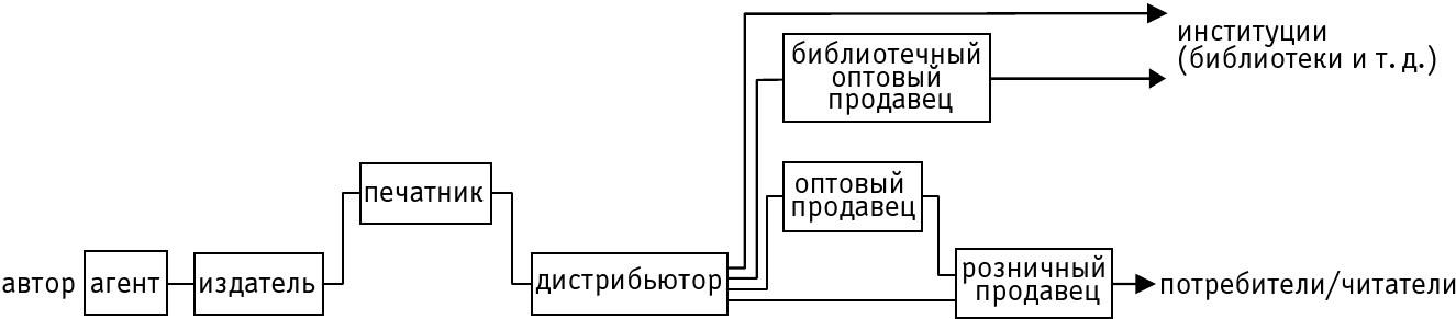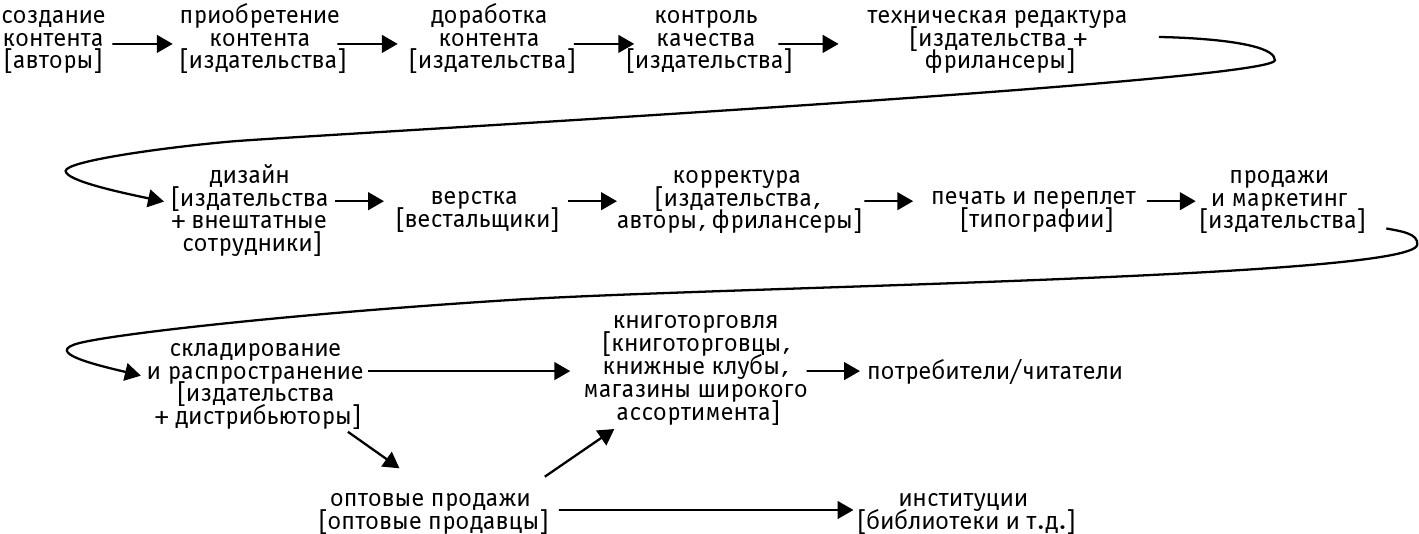 Помимо понятия поля, есть еще одно понятие (или набор понятий), которое нам необходимо для понимания мира массового книгоиздания, — издательская цепочка. Издательство — лишь один из игроков в поле, и то, как издательства связаны с другими игроками, определяется цепочкой действий, в которой разные агенты или организации выполняют разные роли, ориентированные на общую цель — производство, продажу и распространение культурного товара под названием «книга».