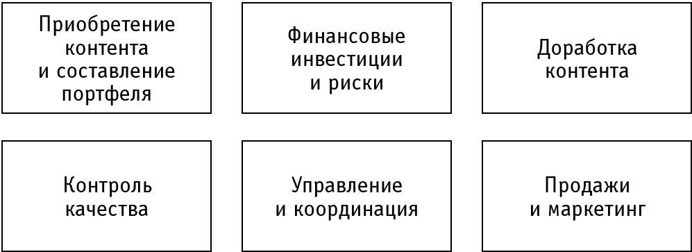 Поскольку издательская цепочка не является жесткой и конкретные задачи или функции могут исчезать в результате экономических и технологических преобразований, не делает ли это роль непосредственно издательства излишней? Каковы основные виды деятельности или функции издательства? Могут ли новые технологии сделать его деятельность ненужной и может ли кто-то другой заменить его? Можно ли устранить издательства из издательской цепочки? В последние годы эти вопросы поднимались довольно часто. В эпоху, когда любой может публиковать текст в интернете, кому еще нужны издательства? Но эти вопросы сложнее, чем может показаться на первый взгляд, и для правильного ответа на них необходимо более тщательно проанализировать ключевые функции, традиционно выполняемые издательствами, и отделить их от других видов деятельности, которые могут быть переданы сторонним организациям или специализированным фирмам. На рисунке 4 показаны шесть ключевых функций издательства — выполняя именно эти задачи или функции, издательство традиционно вносит свой особый вклад в процесс создания ценности.