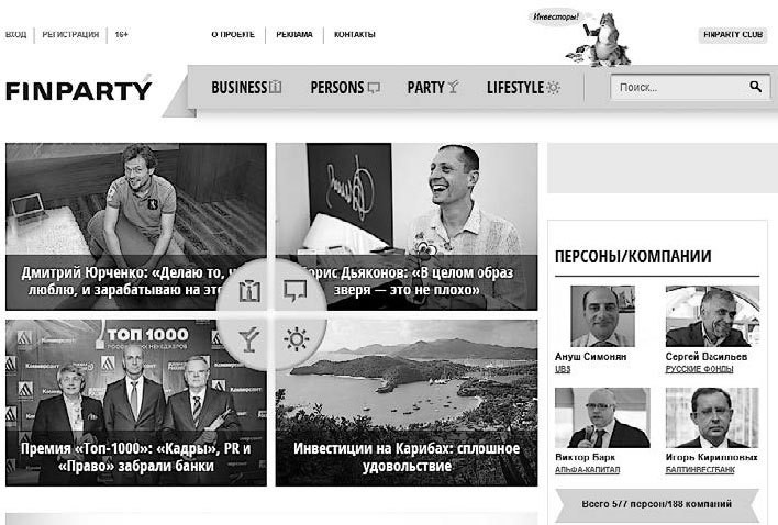 Рис. 3.1. Сайт Finparty.ru – о людях, событиях и светской жизни в сфере финансов. Ресурса, посвященного этой стороне финансового мира, очень не хватало профессионалам