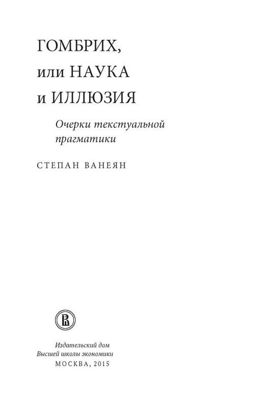 В17 Гомбрих, или Наука и иллюзия. Очерки текстуальной прагматики / С. С. Ванеян; Нац. исслед. ун-т «Высшая школа экономики». — М.: Изд. дом Высшей школы экономики, 2015. — 304 с. — (Исследования культуры). — ISBN 978-5-7598-1257-9 (в пер.).