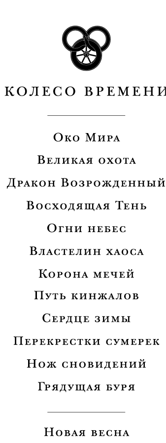 Издательство благодарит за помощь в работе над циклом «Колесо Времени» Бориса Германовича Малагина,