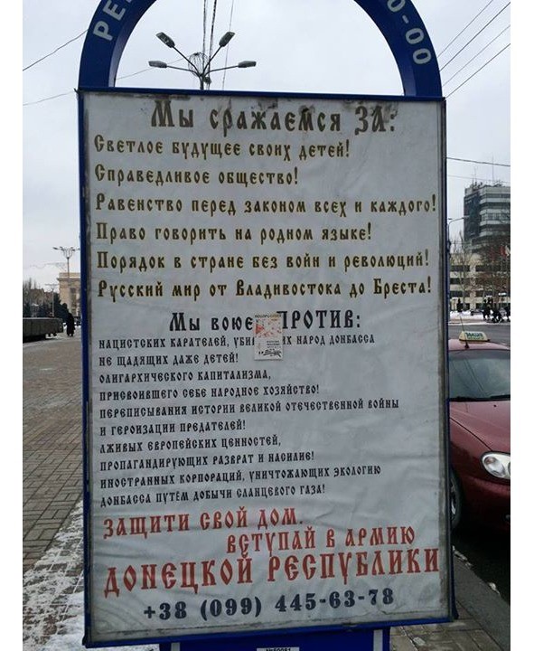 Народ Донбасса вынужден был восстать простив наступления киевского фашизма, против тирании и угнетения, и остановил его наступление, путь на временных и плохих границах, но остановил. Теперь новым государствам пора подумать о целях блага самого этого человека, с тем, чтобы народу Донбасса когда либо вновь не пришлось прибегать к последнему средству восстановления своих попранных прав — восстанию.