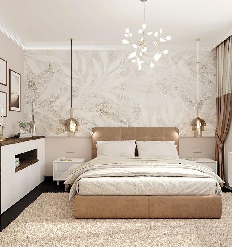 В этом проекте кровать у клиентов уже была. К тому же были готовы полы достаточно темного цвета и такие же темные двери. Так как кровать является центральным элементом спальни, было решено продумать общий стиль, направление и цветовую гамму с опорой на внешний вид кровати. Она однозначно задавала мягкий стиль, светлые бежевые тона; однако и темные контрастные полы и двери требовали поддержки. В итоге получился нежный интерьер с контрастными акцентами, где основная гамма выдержана в мягких пастельных тонах, а темные цвета добавлены минимально, так как площадь полов и дверей и так внушительная.