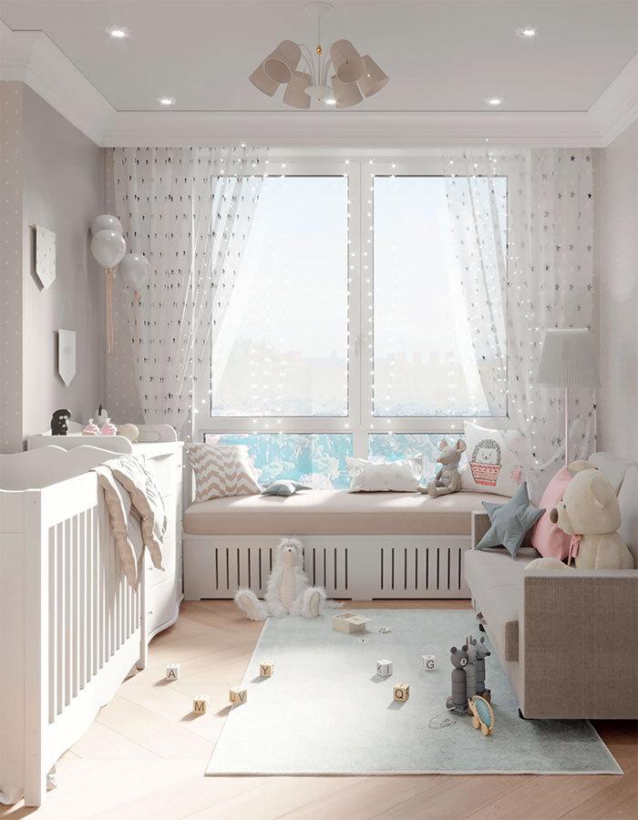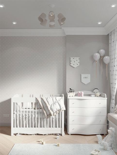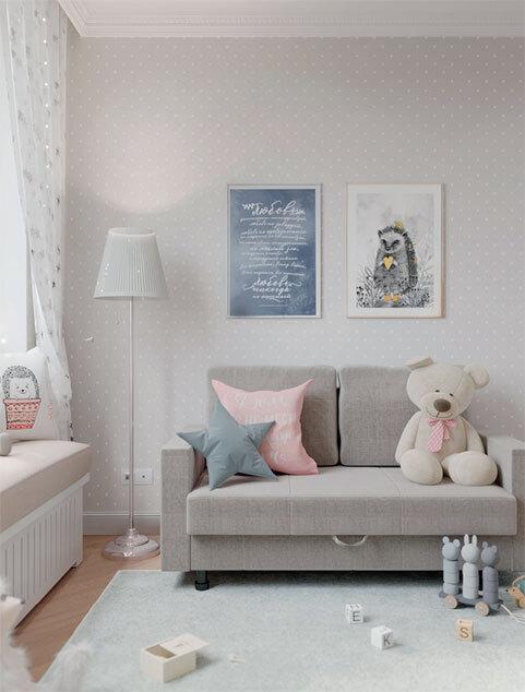 В подобных случаях спокойный цвет и нейтральный узор (например, горошек) – идеальный вариант оформления интерьера. Позже эта отделка станет удобным фоном для создания комнаты для ребенка любого пола: сюда возможно добавить и нежный розовый оттенок, и насыщенный синий, а можно остаться в рамках неброского монохрома.