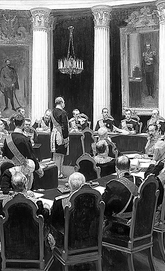 В заключение намечены были предположения о порядке привлечения представителей населения к участию в законодательной деятельности. В этих видах предположено было ввести в состав Государственного совета, на равных основаниях с членами, по высочайшему назначению, выборных представителей от губернских земских собраний и городских дум более крупных городов. Имелось в виду, что предполагавшееся распространение земских общественных учреждений на всю империю и расширение слоев населения, в них представленных, будут иметь следствием и постепенное расширение участия населения в законодательной деятельности как в географическом отношении, так и в смысле углубления социального базиса.