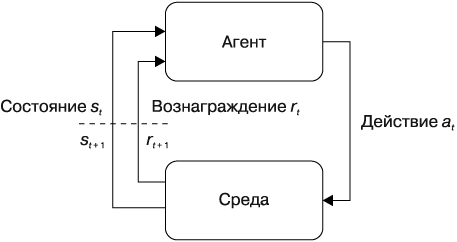 Задачи RL могут быть представлены как система, состоящая из агента и среды. Среда предоставляет информацию, описывающую состояние системы. Агент взаимодействует со средой, наблюдая состояние и используя данную информацию при выборе действия. Среда принимает действие и переходит в следующее состояние, а затем возвращает агенту следующее состояние и вознаграждение. Когда цикл «состояние→действие→вознаграждение» завершен, предполагается, что сделан один шаг. Цикл повторяется, пока среда не завершится, например, когда задача решена. Полностью этот процесс показан на диаграмме цикла управления (рис. 1.2).