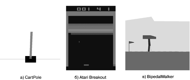 Рассмотрим для обучения с подкреплением три примера сред (рис. 1.3) и определения состояний, действий и вознаграждений. Все эти среды можно получить в OpenAI Gym — библиотеке с открытым исходным кодом, которая предоставляет стандартизованный набор сред.