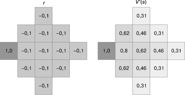 Справа показаны полезности Vπ(s), рассчитанные для каждого состояния по вознаграждениям с помощью уравнения (1.10) при γ = 0,9. Функция полезности Vπ всегда зависит от конкретной стратегии π. В этом примере взята стратегия π, при которой всегда выбирается кратчайший путь к целевому состоянию. Если стратегия будет другой — к примеру, перемещение только вправо, — то значения полезностей будут иными.
