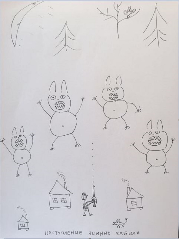 — Татьяна! — окликнула ее Выхухоль. — Ты когда картину-то нам сделаешь, «Нападение зимних зайцев на деревню»? Сто лет ждем!