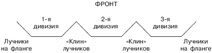 Тяжеловооруженные всадники несли мечи, копья и кинжалы. Копье – наследие конных атак; оно служило превосходным оружием. Использовалось и пехотой, но мы не имеем сведений, применялось ли ею в больших сражениях Столетней войны. Меч – основное оружие рыцарей армии Эдуарда: копье громоздко, его нельзя применять в схватке, даже место меча часто занимал кинжал. Рыцари почти на всех изображениях вооружены кинжалами. Когда начиналась битва, рыцари спешивались и отдавали своих лошадей оруженосцам; те отводили их в тыл, где находился обоз[35], – им предстояло охранять его, пока длится сражение. Тем временем тяжеловооруженные всадники выстраивались в линию двумя маршалами; после этого, если враг еще стоял неподвижно, разрешалось выйти из строя и начать атаку. Обычно каждая дивизия[36] армии (всего их три) располагалась в линию, защищенную по флангам лучниками. В редких случаях, когда начиналось преследование противника, оруженосцам разрешалось, после того как они помогали своим рыцарям сесть на коня, сопровождать их в бою. Как и тяжеловооруженные всадники, лучники в начале битвы спешивались. Мы видели, чтó происходило, когда начиналась битва, с лошадьми тяжеловооруженных всадников; точных сведений о судьбе коней лучников нет, – возможно, кто-то из лучников уводил их в тыл. Лучники формировались в «herces», или выпуклые клинья, которые в узкой части разделялись тяжеловооруженными всадниками, а в широкой, наоборот, соединялись. Результатом такого построения стало то, что между частями войска создавался непроходимый барьер, все фланги также защищал огонь лучников. В графическом построении оно выглядит так: