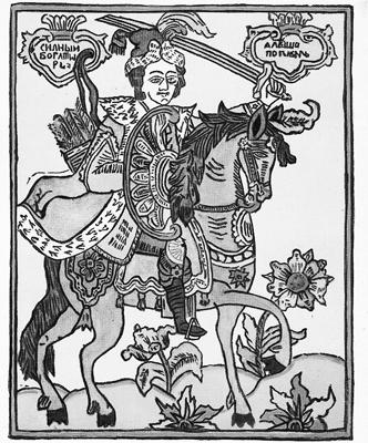Сильный богатырь Алеша Попович. Гравюра на дереве. XVIII век {6}