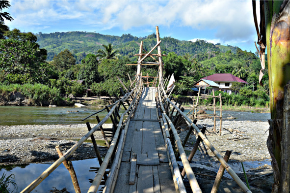 В стоимость поездки «прицепом» входило посещение мегалита Палиндо и водопада в долине Бада. Саквояж был уже собран, фотоаппарат в рюкзачок за спину и на мотоцикл. При выезде из деревни воду купила и еду для нас. А тут сразу за окраиной речка горная с мостом висячим обнаружилась, где дырка на дырке и палки торчком. Я не могла этого вынести и потребовала остановки. Пешком я ту преграду прошла, а мой попутчик перебрался с мотоциклом.