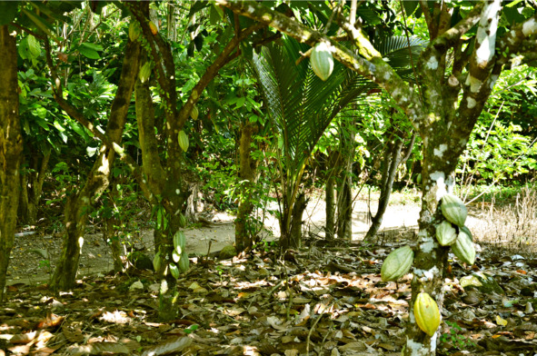 Солнечный свет едва пробивался сквозь кроны могучих деревьев. Было очень жарко, хоть лес и не дождевой. Время от времени тропу преграждали поваленные деревья с выпиленными нишами для проезда, и мы осторожно в них протискивались. А потом вдруг мы въехали в заброшенную шоколадную рощу! Она была светлая и просматривалась насквозь.