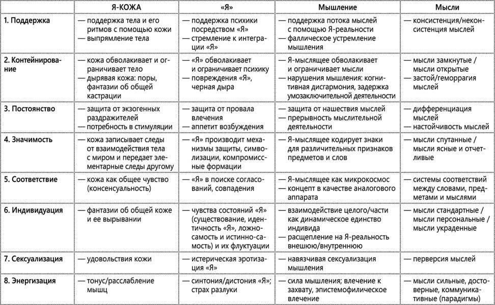 Д. Анзье выделял три функции Я-КОЖИ, вдохновленные функциями кожных органов, но в данном случае на психическом уровне. Это функции удержания, или контейнирования, индивидуации и регистрации следов (значимости).