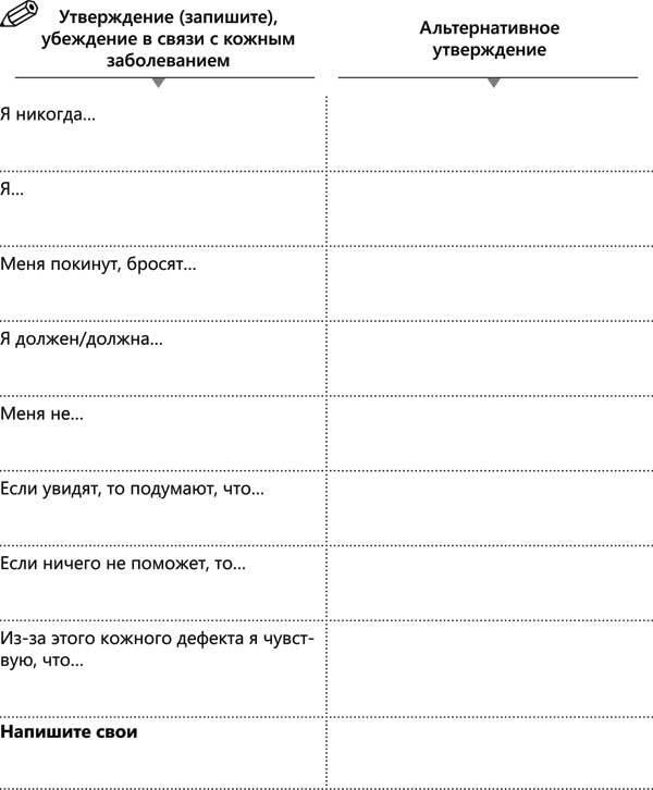 Знакомство с книгой мы начнем с того, что я попрошу рассказать историю о том, что с вами произошло, что именно беспокоит, как бы вы объяснили свои симптомы и продолжающееся страдание. Как вы думаете, что поддерживает вашу проблему, почему именно кожа? Помните, сила истории, которую вы рассказываете себе, заключается в ее влиянии не только на ваши эмоции, но и на поведение. Часто именно нерассказанная эмоционально-травматическая история и то, как вы ее рассказываете, удерживала вас в психологическом тупике от начала излечения. Изложите свой рассказ письменно, осознанно обращая внимание на привычные детали. Опишите, каким образом конкретные предположения, допущения приводят к конкретным мыслям, эмоциям, кожным проявлениям. Найдите мысли, эмоции, ситуации, которые причиняют вам больше всего страданий.