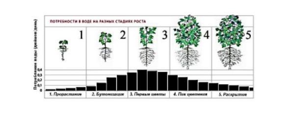 На рис. 1 показана оптимальная потребность хлопчатника в воде на разных стадиях роста и развития его кустов [5].