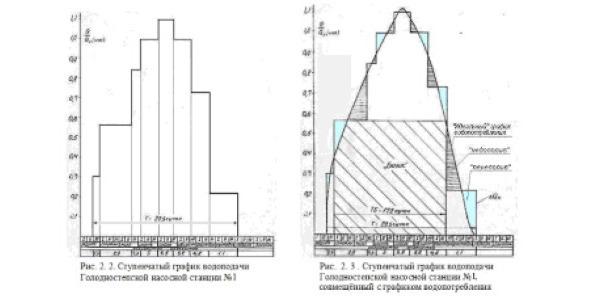При машинном орошении максимально возможное приближение водоподачи насосной станции к графику водопотребления растений осуществляется, как правило, путём изменения числа одновременно работающих насосных агрегатов. Например, на рис. 2 изображён ступенчатый график водоподачи Голодностепской насосной станции №1 (Таджикистан), оснащенной шестью вертикальными насосами 52В-11 (1200В-6,3/100-УЗ).
