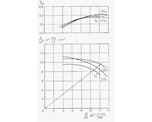 Из технической литературы [9,10] известны теоретические положения и результаты немодельных (т.е. с нарушением законов геометрического подобия) исследований влияния геометрических параметров рабочего колеса и спирального отвода на характеристики центробежных насосов. На рис.5 приведены энергетические характеристики насосов, отличающихся друг от друга размером b2 центробежного колеса на выходе при одном и том же спиральном отводе, а на рис.6 и 7 показаны энергетические характеристики насосов отличающихся друг от друга площадью выхода из спирального сборника при одном и том же рабочем колесе.