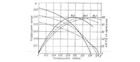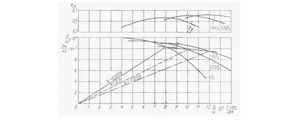 Из рассмотрения рис. 6 и 7 следует, что наиболее широкий диапазон регулирования подачи насоса, при сохранении в оптимальной зоне практически неизменных значений к. п. д. и при незначительных изменениях напора, достигается за счёт изменения площади проходных сечений спирального отвода.