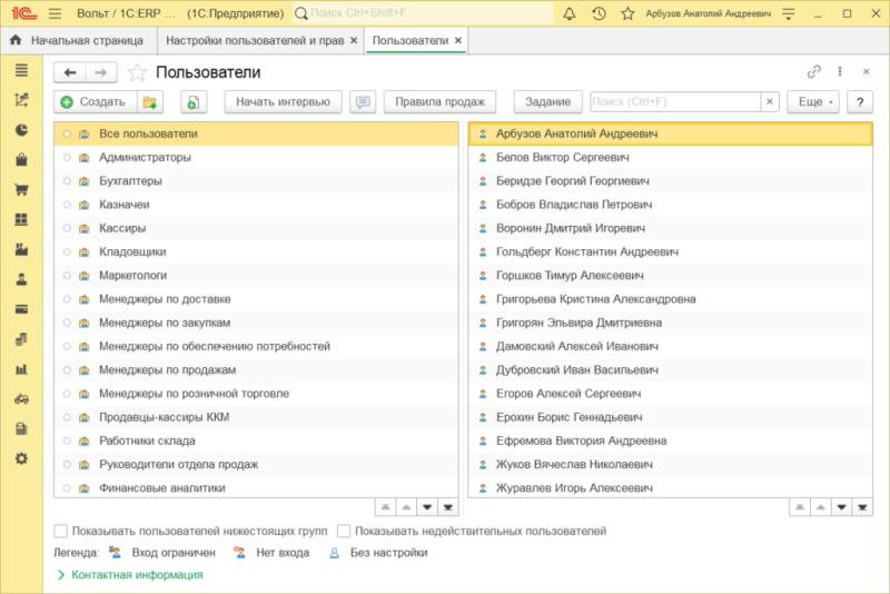 Чтобы сотрудники фирмы «Вольт» имели доступ к информационной базе, их необходимо занести в справочник Пользователи (НСИ и администрирование – Администрирование – Настройка пользователей и прав – Пользователи) – рис. 1.5. Для удобства ведения справочника сотрудники могут быть сгруппированы по должностям, отделам, филиалам, по любым другим принципам.