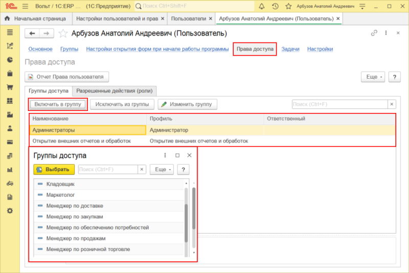 Для каждого пользователя необходимо определить права доступа, включив его в одну или несколько групп доступа (рис. 1.7).