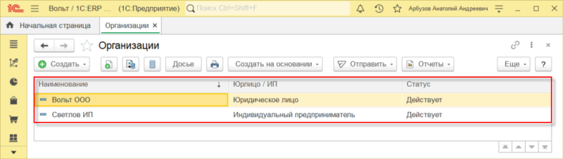 Фирма «Вольт» ведет свою деятельность от имени двух юридических лиц. ООО «Вольт» осуществляет продажи профессионального инструмента на деловом и государственном рынках, а ИП «Светлов» – продажи любительского инструмента на потребительском рынке. Для ведения хозяйственной деятельности (закупка, продажа, оплата и т. д.) по этим юридическим лицам они должны быть добавлены в справочник НСИ и администрирование – НСИ – Организации (рис. 1.8).