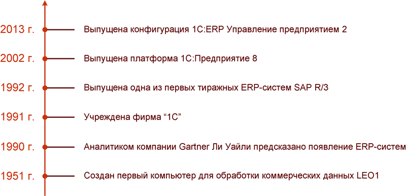 В ходе исследования направлений развития MRP II-систем аналитик компании Gartner Ли Уайли в 1990 г. предсказал [9] появление ERP-систем (Enterprise Resource Planning – «планирование ресурсов предприятия»), в которых к планированию и контролю производственной деятельности добавляются функции управления закупками, маркетингом, продажами, складом, запасами, доставкой, ремонтами, кадрами, финансами. Благодаря сведению всех этих функций в единое информационное пространство становятся возможными быстрое получение сбалансированных планов, оптимизация ресурсов и оценка результатов деятельности всего предприятия. В 1992 г. была выпущена SAP R/3 – одна из первых тиражных ERP-систем для персональных компьютеров.