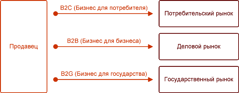 Если покупатели приобретают товар на рынке для конечного потребления, то такой рынок называется потребительским, а коммерческая деятельность продавца на таком рынке называется B2C (Business-to-Consumer, «бизнес для потребителя»).