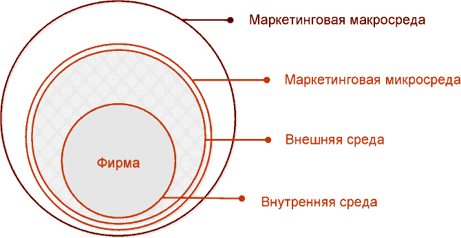 Маркетинговая среда (рис. 2.1) – совокупность внутренних и внешних субъектов и условий, оказывающих влияние на маркетинговую деятельность фирмы. Каждый из этих так называемых элементов маркетинговой среды может вносить как положительный, так и отрицательный вклад в деятельность фирмы. Для достижения своих целей фирме необходимо учитывать влияние этих элементов или оказывать воздействие на них, когда это необходимо и возможно.