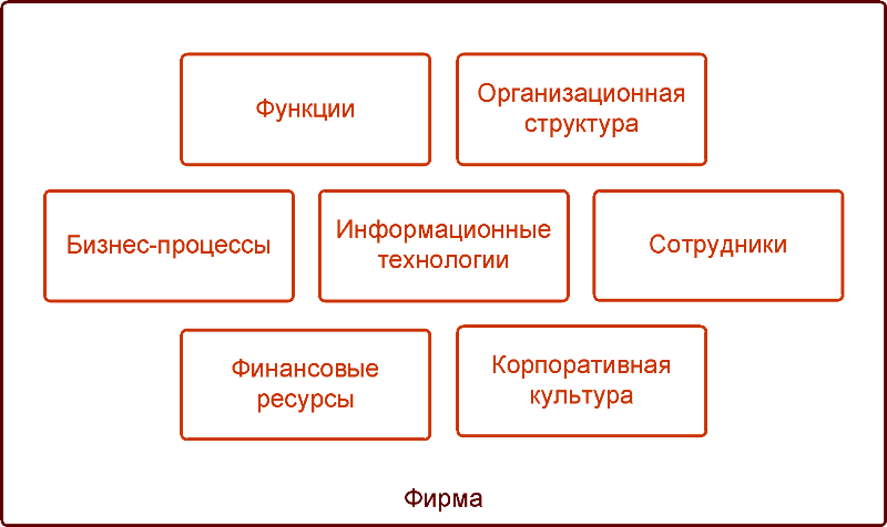 Внутренняя среда (рис. 2.3) представляет собой все элементы внутри фирмы, такие как организационная структура, бизнес-процессы, информационные технологии, сотрудники, корпоративная культура, финансовые ресурсы и другие. Фирма в той или иной мере контролирует все элементы внутренней среды и может их изменить при необходимости. Эти элементы в значительной степени определяют результаты деятельности и потенциал фирмы.
