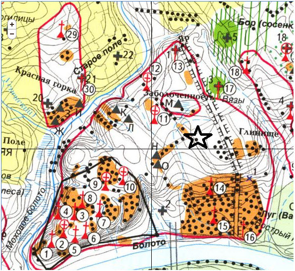 Нумерация в кружочках дана церквям и монастырям. Место будущего здания биржи отмечено пятиконечной звездой. Как видно из представленного рисунка, этот район Гостиного двора в то время был мало населен. Следовательно, данный исторический период мы имеем право считать точкой отсчета для исследования территории, на которой впоследствии будет возведено здание биржи. Таким образом, в конце XIV века улицы с современным названием Ильинка ещё не было, а была лишь дорога от Кремля. Подтверждение этому факту мы находим и у известных исследователей истории Москвы.
