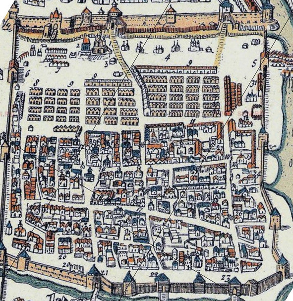 Таким образом, в конце XIV века интересующее нас место улицы, которую мы сегодня называем Ильинкой, и пересекающие её Рыбный и Богоявленский переулки, начинают заселяться торговцами иностранного происхождения. На рисунке видна пятиконечная звезда, которая помещёна на место ныне стоящего здания Торгово-промышленной палаты России. Но что находилось здесь, на данной территории, ранее здания Торгово-промышленной палаты, ранее здания Московской биржи? Нас интересует период с конца XV века до начала XIX века, когда на этом месте было построено здание биржи. Огромный отрезок времени!