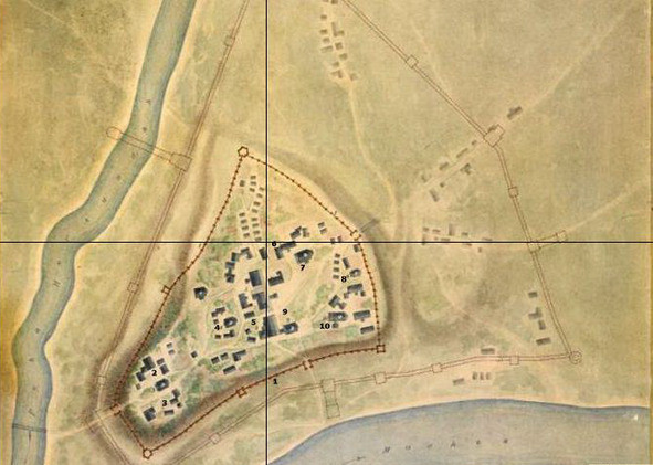 На рисунке 1.1. представлен чертёж «Схематический план Московского Кремля в 1156—1339 гг.» архитектора А. И. Хамцова, выполненный в 1960 году, на котором представлена историческая реконструкция деревянных стен Кремля до постройки дубовой крепости в середине XIV века [1].
