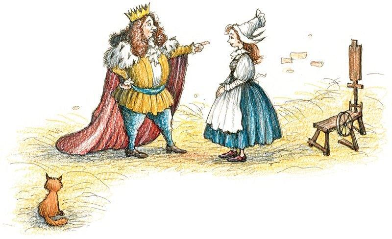 Когда мельник привёл свою дочь, король отвёл её в особую каморку, битком набитую соломой, дал ей самопрялку и мотовило и сказал: «Садись-ка за работу; если ты в течение этой ночи до завтрашнего раннего утра не перепрядёшь всю эту солому в золото, то велю тебя казнить».