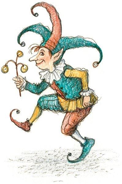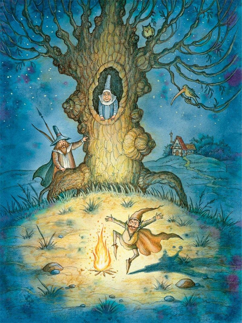 На третий день вернулся гонец и рассказал королеве следующее: «Я не мог отыскать ни одного нового имени, но когда я из-за леса вышел на вершину высокой горы, куда разве только лиса да заяц заглядывают, то я там увидел маленькую хижину, а перед нею разведён был огонёк, и около него поскакивал пресмешной человечек, приплясывая на одной ножке и припевая: