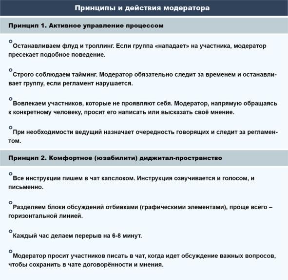Большинство руководителей, не задумываясь над причиной странного поведения сотрудников в диджитал-пространстве, работают «как получится». Потому их взаимодействие с сотрудниками, даже с самыми благими намерениями, зачастую превращается в хаос. Первое и наиболее простое правило диджитал-модерации: даже если общаются два человека, то один из них должен управлять, модерировать процессом. Например, прояснить уже «на старте» вопросы: «Что у нас в итоге должно получиться?», «Сколько у нас есть на это времени?»